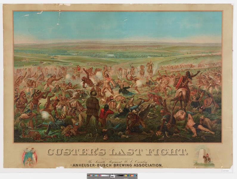 - Image of the Battle of Little Bighorn in Montana during the Great Sioux War of 1876 between Plains Indian tribes and the United States Army 7th Cavalry Regiment under General George Custer; bodies of dead and wounded litter the ground while intense fighting continues with swords, guns, spear, and other weapons; Indians are pictured killing wounded soldiers or scalping bodies; more Indians on horseback race across the plains to join the battle in the background; military medal, bugle, sabers, and flags grouped in lower left margin; man on horseback near a monument in lower right margin; text key in bottom margin indicates figures such as "half breed" and "Cheyenne warrior" as well as specific U.S. soldiers, including General Custer.