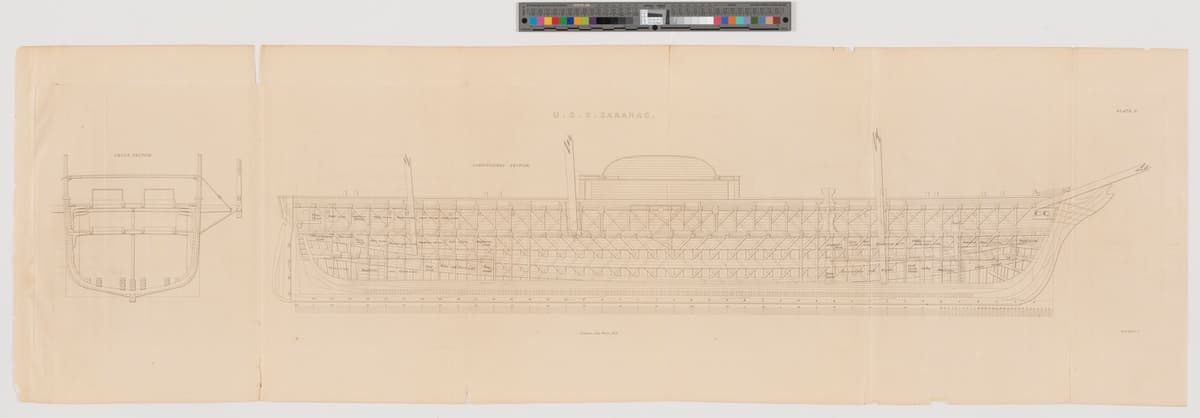 - Image of cross section and longitudinal section plans for the U.S.S. Saranac, including scale in bottom margin; text key labels various quarters, including pumps, galley, magazine, store rooms, and state rooms.