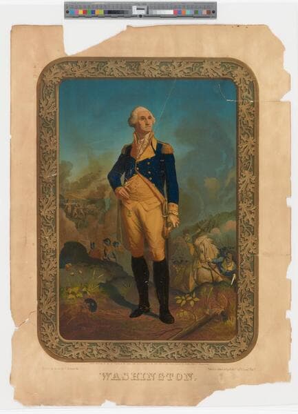 - Image of a full-length portrait of General George Washington in military uniform standing with glove in hand on the edge of a battlefield; battle scene from the American Revolutionary War in background with British soldiers fighting American militia on foot and on horseback amidst explosions and billowing smoke.
