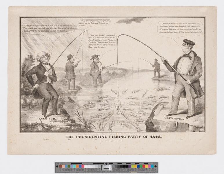Image of a political cartoon on the United States Treasury under the administration of Martin Van Buren; chest labeled "United States Sub-Treasury Independent of the People" drops bags of money on office-holders; Secretary of the Treasury Levi Woodbury holds paper treasury notes for "Coblers and Tinkers;" Van Buren gives bags of money to Secretary of War Joel Poinsett at right.