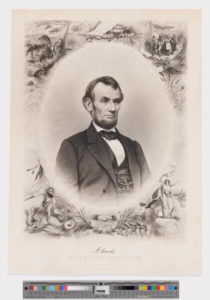 Image of a memorial print for United States president Abraham Lincoln; Lincoln ascends into heaven assisted by Father Time and an angel (or "Immortality") from a crypt; three women at left (Faith, Hope, and Charity) can be seen grieving, one holds her hand out, another with two children in her arms, and a third is slumped forward on her arms weeping; beneath Lincoln is a bald eagle, Union shield on which is written "E pluribus unum" and the goddess Columbia (or Liberty) bowing her head in sorrow, staff with Phrygian cap in hand; Lincoln's discarded armor and sword lie on the ground near a Native American Indian with his hatchet and arrows sitting with head resting on his knees; on the tomb is written the words "A. Lincoln, Died April 15th 1865."
