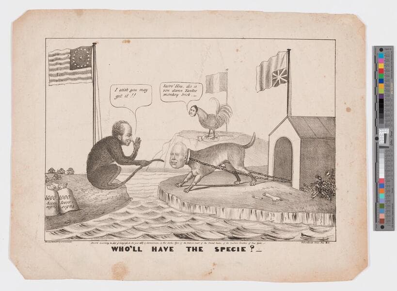 Image of the exterior of the U.S. Government Building for the United States Centennial Exhibition held in Philadelphia, Pennsylvania, in 1876; people visible in front of the hall, including pedestrians, soldiers, Native American Indians, and men on horseback; cannons, an anchor, a large propeller, and an American flag also pictured outside amongst the visitors; large advertisement for "N.Y. Lithographing and Engraving Co. Julius Bien, Superintendent" on verso.