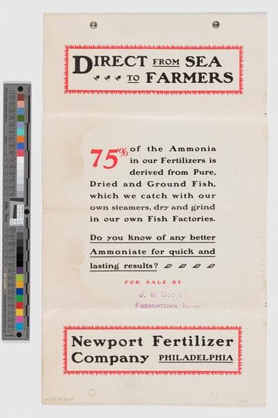Image of bags of fertilizer and barrels of crops "Grown With Standard Fertilizers" and "Grown Without" on a balance scale showing Standard Fertilizer to be the superior choice in an advertisement for Standard Fertilizer Company of Boston, Massachusetts.