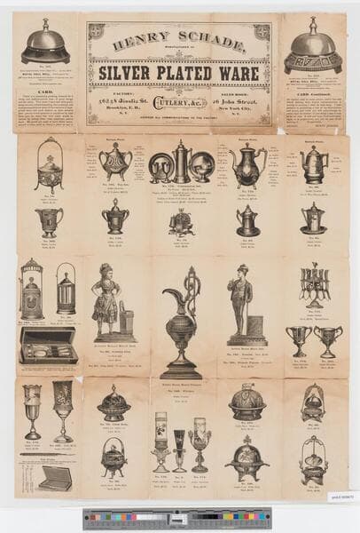 Image of a single-fold price list for silverware, utensils, and serving ware by Meriden Britannia Company of New York, New York (with factories in West Meriden, Connecticut); image of a fork and a medal from the 1853 Exhibition of the Industry of All Nations on front panel with text.