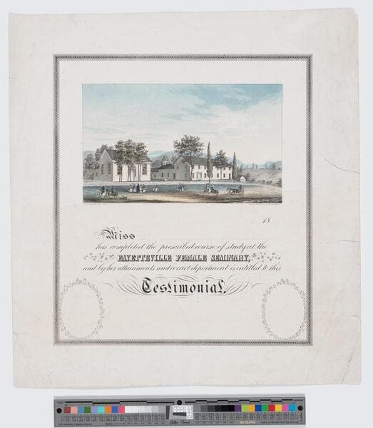 Image of an eye-level view of the Le Roy Female Seminary building at the top of a diploma issued to Mary L. Dean of Caledonia on April 3, 1850.