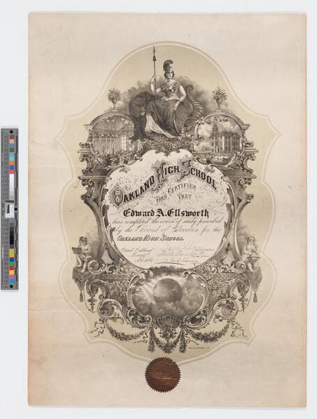 Image of a diploma issued in 1881 to Julia L. McCarthy from the San Francisco Girls' High School; three allegorical women (one with art supplies, one with a torch and eagle, and one with a book and quill pen) above San Francisco seal at bottom center; decorative border made up of "poetry" and "philosophy" columns and portraits of Isaac Newton, Benjamin Franklin, Samuel Morse, William Shakespeare, and Alexander Humboldt surrounding text.