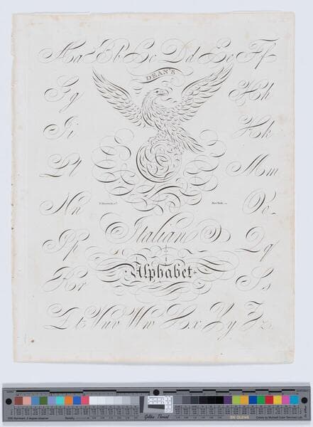 Image of a page of calligraphy and penmanship examples featuring and alphabet flanked by birds, a lion, and an angel with a laurel wreath and herald trumpet; offset image of numbers surrounded by an elaborate frame made up of a bird next to a tree and flowers on verso.