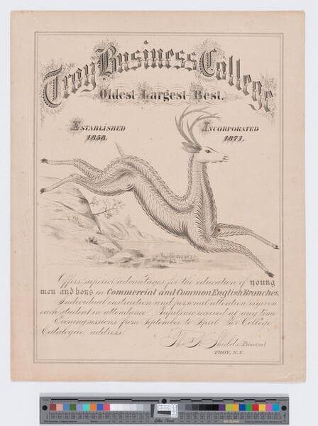 Image of a blank diploma from Eastman's State and National Business College in Poughkeepsie, New York; five main vignettes and decorative borders featuring mythical and allegorical figures, eagles, and a portrait of founder Harvey G. Eastman surround the central text.