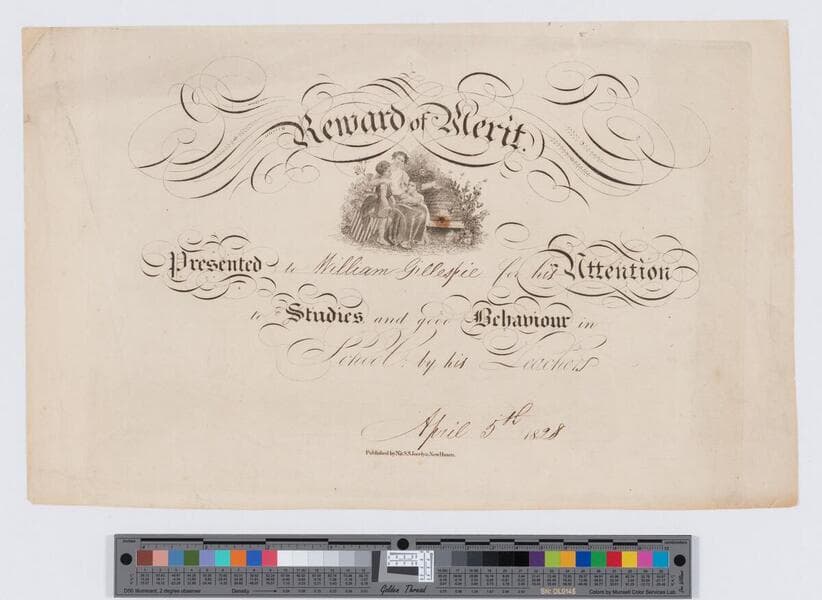 Reward of merit. Presented to William Gillespie for his attention to studies and good behavior in school by his teachers