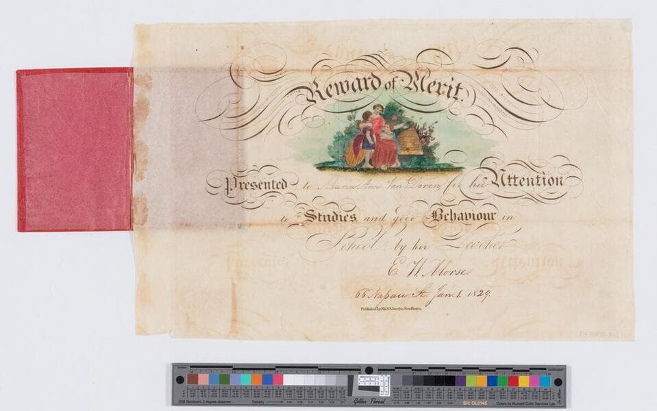 Reward of merit. Presented to Maria Ann Van Doren for her attention to studies and good behavior in school by her teachers
