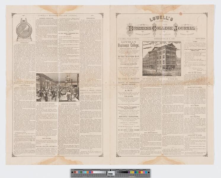 Image of a blank diploma from Eastman's State and National Business College in Poughkeepsie, New York; five main vignettes and decorative borders featuring mythical and allegorical figures, eagles, and a portrait of founder Harvey G. Eastman surround the central text.