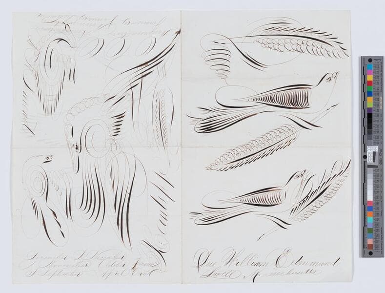 [Paper with drawings of ornamental penmanship birds and feathers]