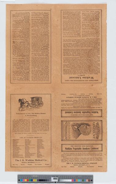 Image of a single-fold leaflet advertising Dr. Flint's Quaker bitters; view of "Dr. Flint's Great Medical Depot" building exterior and storefront in Providence, Rhode Island, description of product, testimonials, and image of a man with a cane standing with bitters in hand on recto; views of the "tank, or generating room" and "bottling and packing department" in the building interior and expanded descriptions of ailments the product can treat on verso.