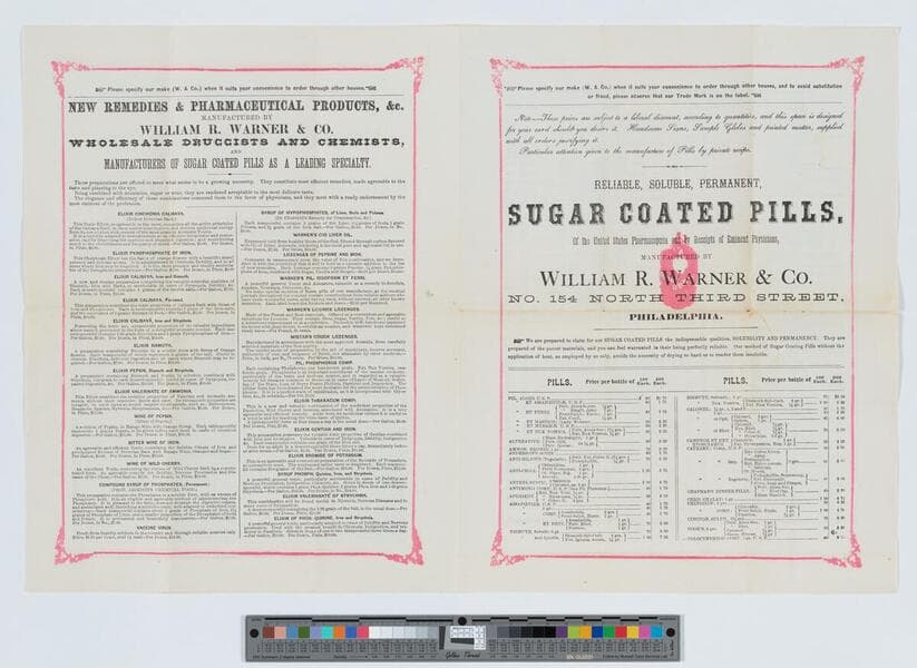 Image of a tri-fold leaflet advertising products manufactured by Hop Pill Manufacturing Company of New London, Connecticut; 8 panels advertise Little Hop Pills, Hop Ointment, and Hop Veterinary Ointment with testimonials, directions, and lists of ailments that can be treated with each; image of a little girl with a doll, rolled package of pills, and dog on recto; image of Hop Pill Manufacturing Company crest with lion, before-and-after images of a woman's complexion, and a horse on verso.