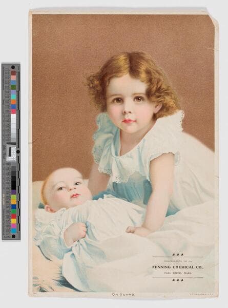 Image of a woman being laced into her corset by a maid in front of a large mirror; maid wears a striped dress with lace and ribbon-trimmed sleeves, an apron, and a lace cap; lady wears a white underskirt, intricate corset which is being laced, chemise with a wide lace-trimmed neckline, a pendant on a ribbon around her neck, and a flower in her hair; "Bon-ton Corset" lettering is featured at top framed by flowers; narrow geometric border surrounds the image.