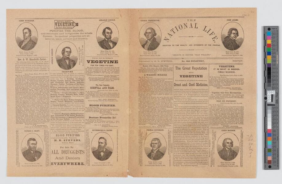 Image of a single-fold leaflet advertising Dr. Flint's Quaker bitters; view of "Dr. Flint's Great Medical Depot" building exterior and storefront in Providence, Rhode Island, description of product, testimonials, and image of a man with a cane standing with bitters in hand on recto; views of the "tank, or generating room" and "bottling and packing department" in the building interior and expanded descriptions of ailments the product can treat on verso.