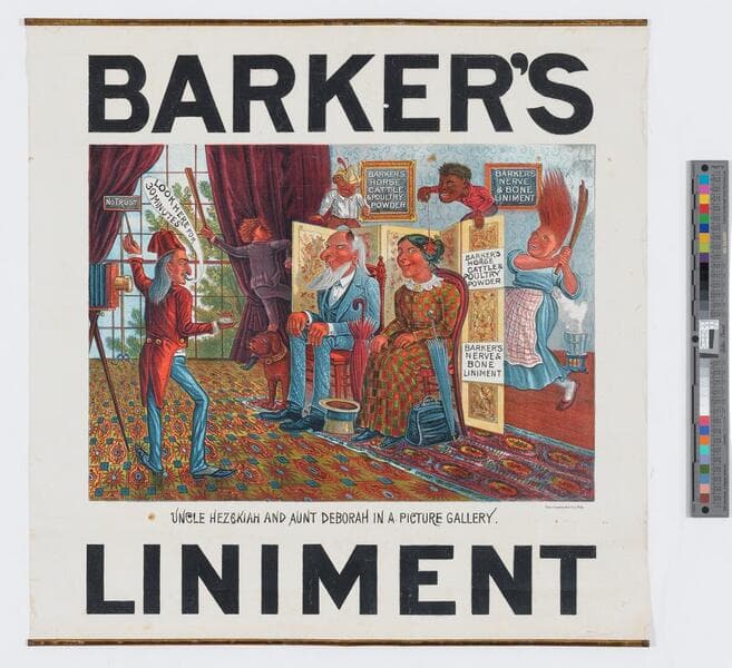 Image of a double-fold leaflet advertising Watkins Vegetable Anodyne Liniment manufactured by the J.R. Watkins Medical Company of Winona, Minnesota; image of horse-drawn vehicle, bust-length portrait of J.R. Watkins, directions for use, and list of ailments it can be used to treat on recto; shorter advertisements for Watkins Germicide and Watkins Fly Powder and General Insecticide with product packaging images on verso; descriptions of Watkins Vegetable Anodyne Liniment in German and Norwegian also included on verso.