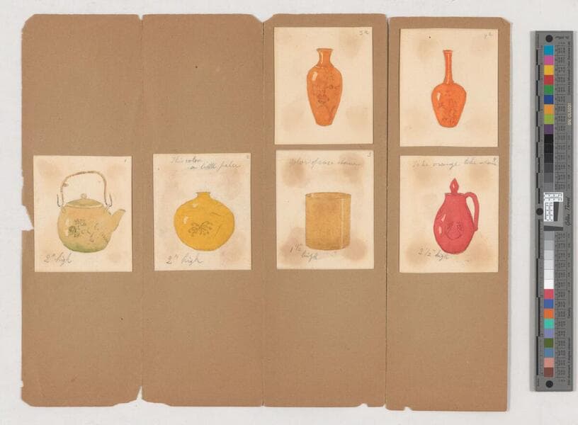 Image of seven small watercolor paintings of Oriental vases and vessels mounted on a folded sheet; notes with numbers and dimensions in pencil on each.