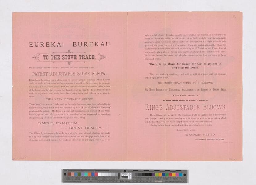 Image of a four-fold leaflet advertising the improved hot-blast Oriental stove manufactured by Perry & Company of Albany, New York, and sold by Fawcett, Hawkes & Company of Boston, Massachusetts; cutaway diagram of the stove, ventilating platform, kettles, description and list of fairs the stove was awarded at in 1870 on recto; diagram of the stove and description on verso.