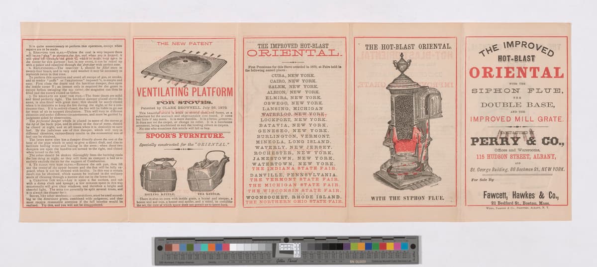 Image of a three-fold leaflet advertising stoves manufactured by Littlefield Stove Manufacturing Company of Boston, Massachusetts; descriptions and image of a parlor furnace on recto; four models of stoves and furnaces pictured on verso, including the "Morning Glory of 1868."