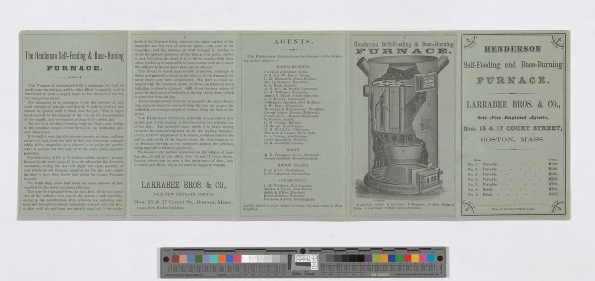 Image of a four-fold leaflet advertising the Henderson self-feeding and base-burning furnace manufactured by Eddy & Corse of Troy, New York, and sold by Larrabee Brothers and Company of Boston, Massachusetts; cutaway diagram of the Henderson furnace with description and list of agents on recto; customer testimonials on verso.