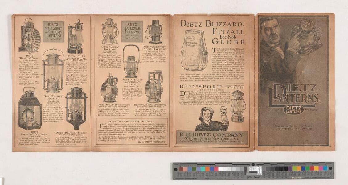 Image of a three-fold leaflet advertisement for Dietz Lanterns manufactured by R.E. Dietz Company of New York City; 29 models of lanterns pictured with measurements and features on recto and verso; four Dietz globes for use in their lanterns pictured and described on recto.