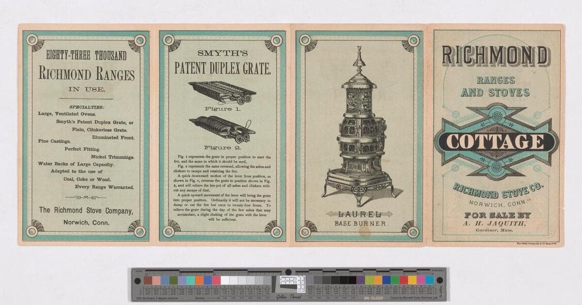 Image of a three-fold leaflet advertising the Mansard Cook stove manufactured by Daniel E. Paris & Company of Troy, New York; vignette of stove in the home and three models of stoves with descriptions on recto; three models of stoves and descriptions on verso.