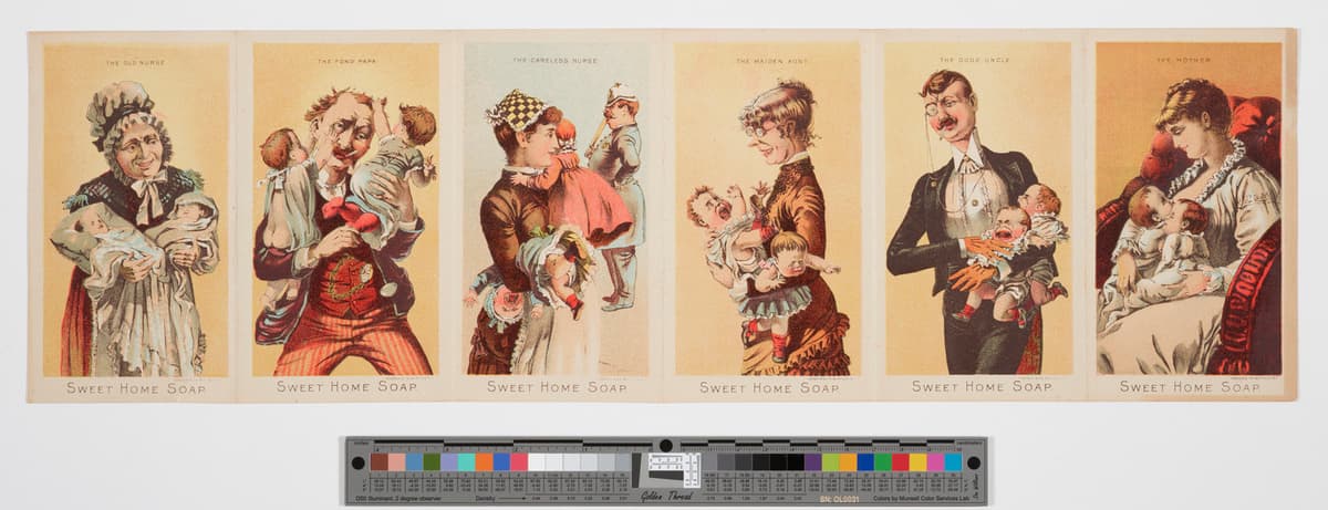Image of a five-fold leaflet advertising Sweet Home family soap manufactured by J. L. Sarkin & Co. of Buffalo, N.Y.; six panels illustrate the phases of a romantic relationship with a pair of anthropomorphized owls and frogs, including admiration, consummation, dissipation, desperation, reparation, and restoration; image of a pocket watch, retail information and testimonials on verso.