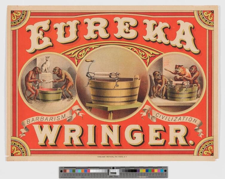 Image of an advertisement for Eureka laundry wringers; large central image of woman in flowing robes, cape, and Liberty cap putting an American flag through a Eureka wringer on top of a globe with a large bald eagle at her side; ten smaller vignettes surrounding central image with an Uncle Sam-type salesman demonstrating and selling the Eureka wringer to people all over the world.