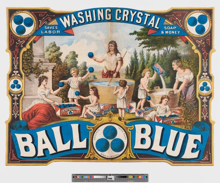 Image of an advertisement for J. Thompson's washing compound and soaps; woman in flowing robes seated on a large sphere of soap at center of an elaborate decorative frame with soap in one hand and a banner in the other; man and woman in top corners each using soap; interior and exterior views of J. Thompson's business building and store in bottom corners of image.