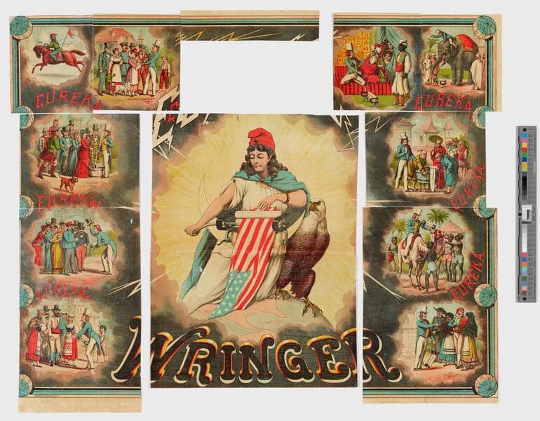 Image of an advertisement for the Eureka wringer; image of wringer and wash tub at center in circular frame; two monkeys wring out wet fabric by hand over a wooden wash tub while a house cat looks on at left; two monkeys force an oversized snarling cat through a wringer over a wash tub causing its tail to bleed at right; decorative border.