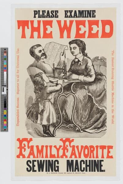 Image of an advertisement for sewing machines manufactured by Wheeler & Wilson; center image of Wheeler & Wilson's New York City buildings surrounded by eight vignettes featuring six sewing machine models and two women, one sewing by hand by candlelight and one comfortably sewing with a machine.