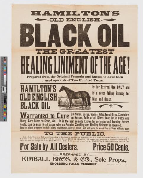 Hamilton's old English black oil the greatest healing liniment of the age!