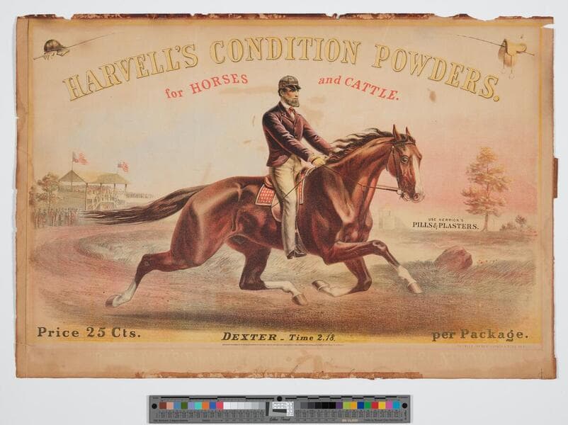 Image of an advertisement for White's golden tonic prepared by Kimball Bros. & Co. of Enosburg Falls, Vermont; horse at center of text advertisement explaining the ailments the tonic can cure for horses.