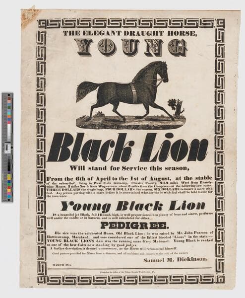 Image of an advertisement for stud services for the horse Henry Clay owned by Joseph P. Seeds of Chester County, Pennsylvania; image of horse at top center with advertising text; decorative botanical border.