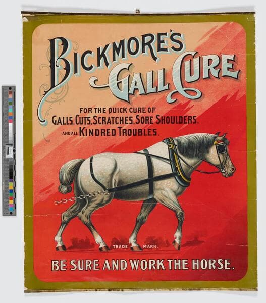 Image of an advertisement for Hamilton's old English black oil prepared by Kimball Bros. & Co. of Enosburg Falls, Vermont; horse at center of text advertisement explaining the ailments the oil can cure for livestock.