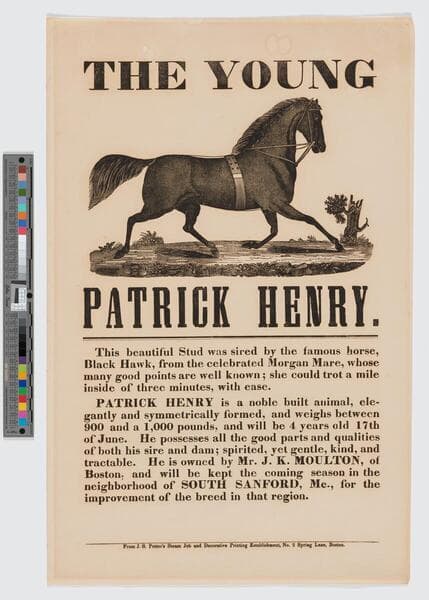 Image of an advertisement for stud services for the horse Henry Clay owned by Joseph P. Seeds of Chester County, Pennsylvania; image of horse at top center with advertising text; decorative botanical border.