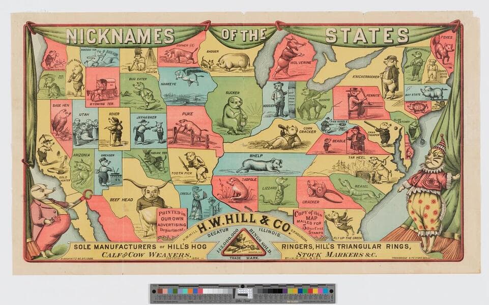 Image of a pig and pork-themed map of the United States with an elaborate border of pigs for every state along with pork related food suggestions and the year of statehood; vignettes of pig-related legal proceedings in left and right bottom corners.