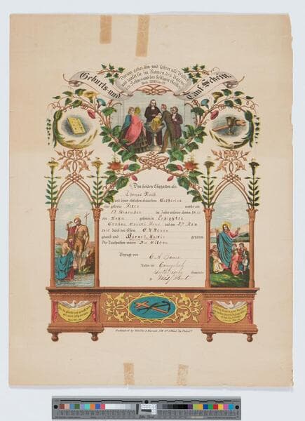 Image of a birth and baptism certificate; baby being baptized by a priest at top center with several people looking on near the baptismal basin; elaborate decorative frame for text with vignettes of a man being baptized, tablets with the Ten Commandments, a chalice and cross, Jesus Christ speaking to a group of children, doves with Bible verses on banners, and a cross and anchor.