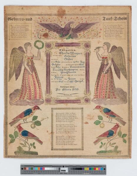 Image of a birth and baptism certificate; angels, birds, flowers, and an American eagle surround certificate text.