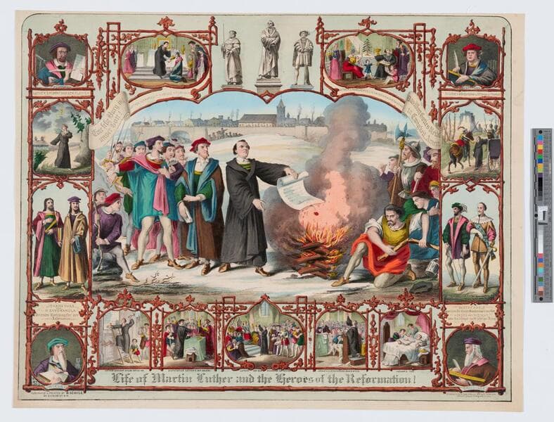 - Image of Martin Luther Luther burning papal bull of excommunication, with elaborate border featuring captioned vignettes from Luther's life and portraits of Jan Hus, Girolamo Savonarola, John Wycliffe, Kaspar Cruciger, Philipp Melanchton, Johann Bugenhagen, King of Sweden Gustav II Adolf, and Bernhard, Duke of Saxe-Weimar.