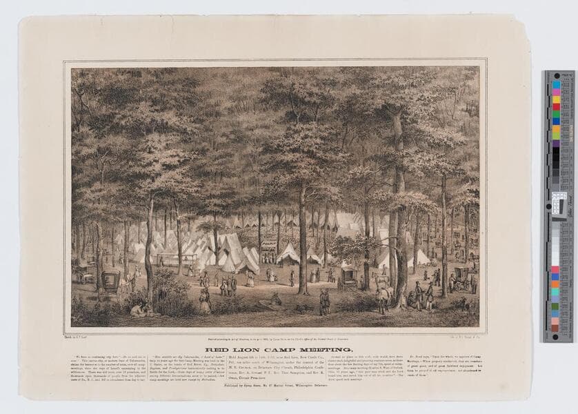 Image of an aerial view of Union military Camp Brandywine in Delaware during the American Civil War; tents, soldiers, and American flags with hilly countryside in background; names of Pennsylvania Reserve 3rd Regiment military personnel in bottom margin.