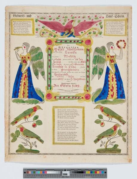 Image of a birth and baptism certificate; angels, birds, flowers, and an American eagle surround certificate text.