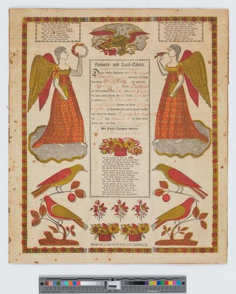 Image of a birth and baptism certificate; angels, birds, and a cherub with a horn surround certificate text.
