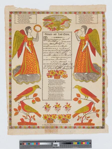 Image of a birth and baptism certificate; angels, birds, flowers, and an American eagle surround certificate text.