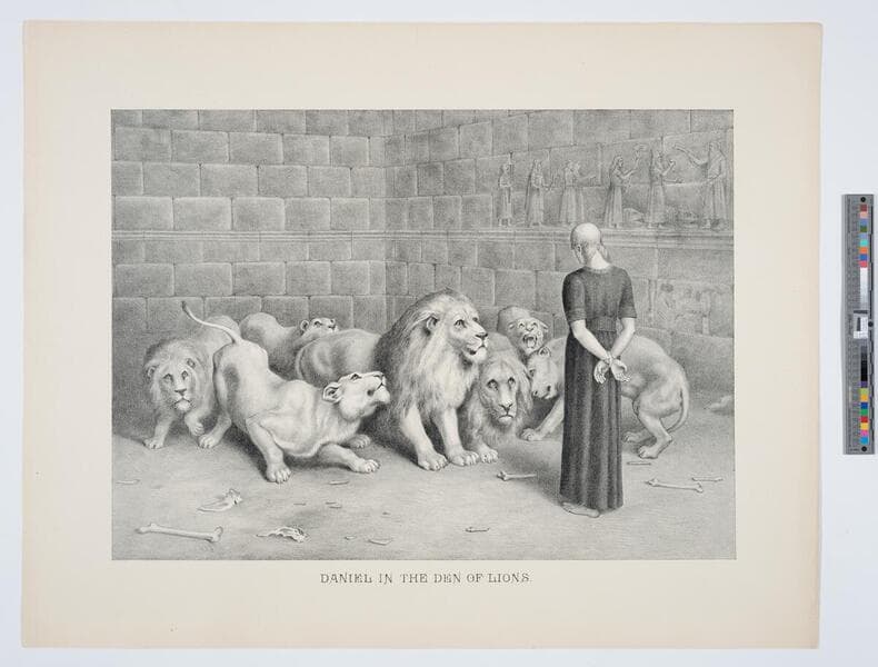 Image of lion tamer Terrell Jacobs (1903-1957) holding a whip in the center of a circus cage with numerous lions surrounding him with bared teeth.