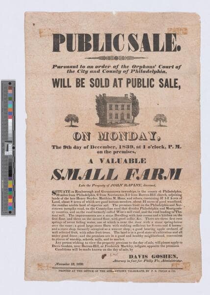 Image of a broadside advertising the auction of a farm in Doylestown, Pennsylvania, including land, buildings, livestock, agricultural machinery and implements, grain, and produce; images of barn and farmhouse, a cow, horse being led by a man, and pigs, surrounded by advertisement text.