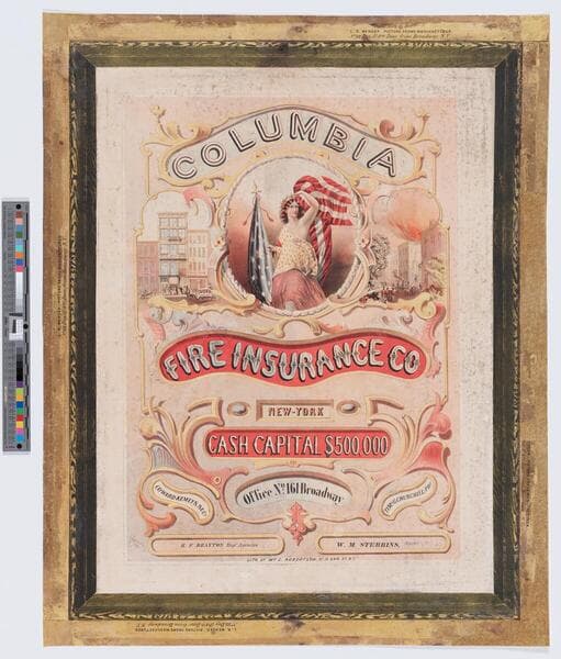 Image of an advertisement for Springfield, Massachusetts, Fire & Marine Insurance Company; Columbia seated at center holding a draped American flag and a Union shield aloft an a sword and laurel crown in her other hand; globe, books, and American eagle flank her; burning city and ships at sea in background.
