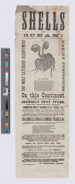 Image of an advertisement for the Harmony Fire and Marine Insurance Company of New York City; a boy stands at center with a lion, lamp, cat, and pair of doves in an oval floral frame; three women among palm trees, foliage, and flowers make a larger rectangular frame; American flag banners at top right and left; seascape of ships sailing near coastlines at bottom center.
