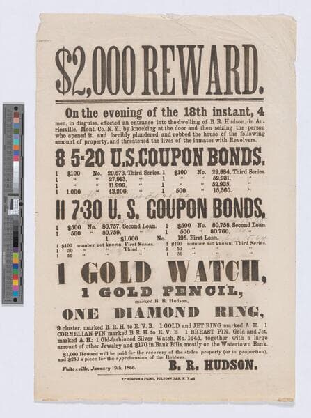 Contemporary copy. Resolution offering reward of $10,000 for the arrest and conviction of the murderer or murderers of the late President of the United States. Certified by John A. Thompson, Register's Office, 1865 May 3. (2 pages)